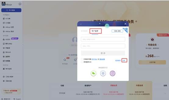 登录和注册:IP范围内,点击链接https://www.aminer.cn/进入AMiner主页。