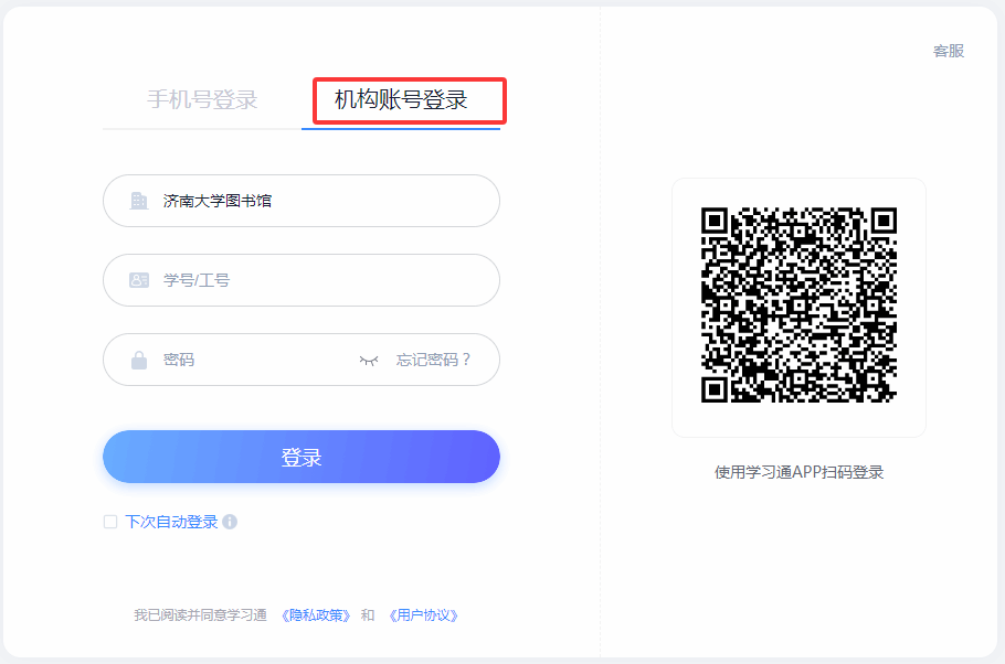 【访问方式】:选择“机构账号登录”方式,学号/工号输入“TEST0001”,密码输入“gV$6r9d8!lUfbrd”,点击“登录”。