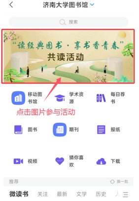 读者通过移动图书馆(学习通)进入指定活动页面,阅读图书馆指定书籍,通过活动期间的每日打卡和阅读时长获取积分。