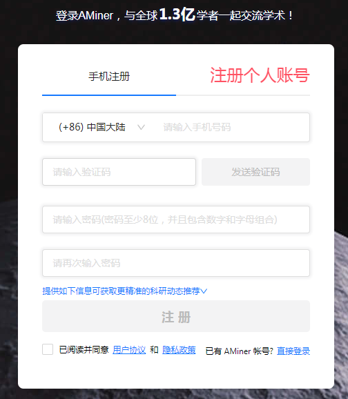 登录和注册:IP范围内,点击链接https://www.aminer.cn/进入AMiner主页。