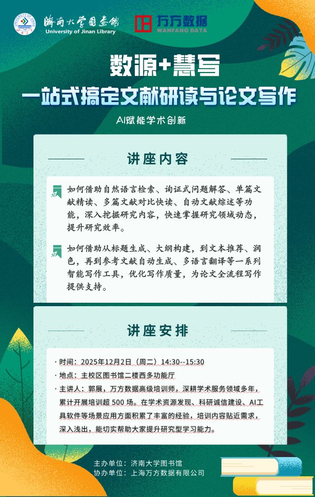 郭展,万方数据高级培训师,深耕学术服务领域多年,累计开展培训500余场。在学术资源发现、科研诚信建设、AI工具软件等场景应用方面积累了丰富的经验,培训内容贴近需求,深入浅出,能切实帮助大家提升研究型学习能力。