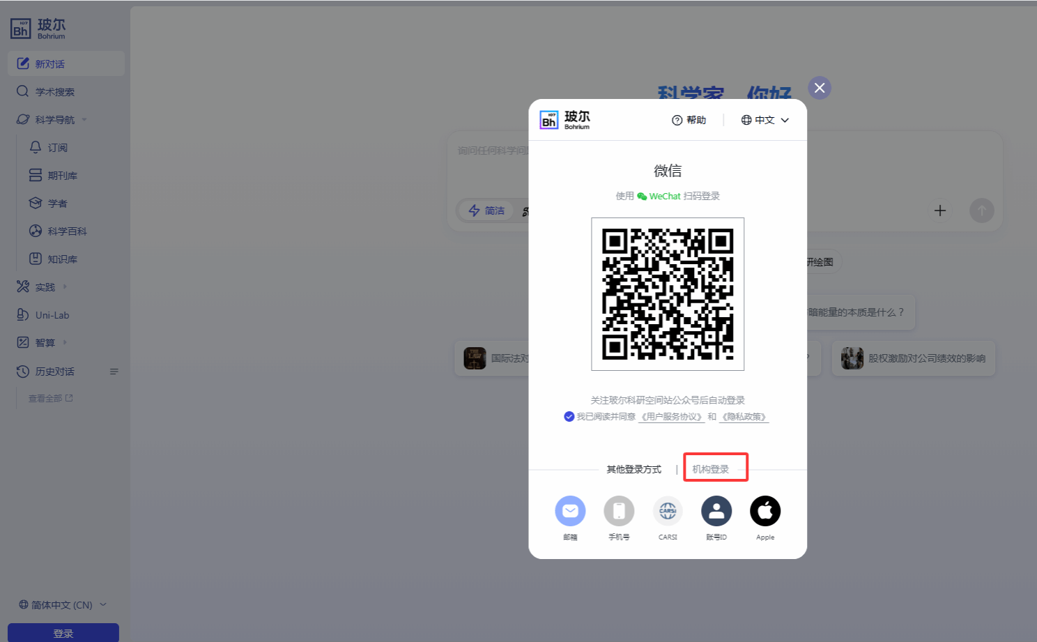 方式二:访问玻尔官网(https://www.bohrium.com),从“机构登录”页选择济南大学进行登录;