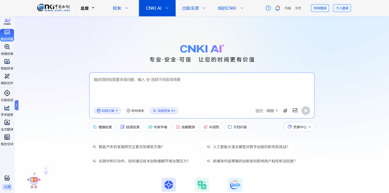 CNKI AI,是中国知网全面拥抱AI,赋能知识服务的全新探索,是推进问答式增强检索和生成式知识服务的场景实践。平台基于AI技术驱动的专业知识+深度思考、可信增强+可控生成的智能化服务,理解更加精准全面,解答更有专业深度,构建人工智能时代学术研究、科技创新、科学决策、全民阅读和人才培养的新范式。