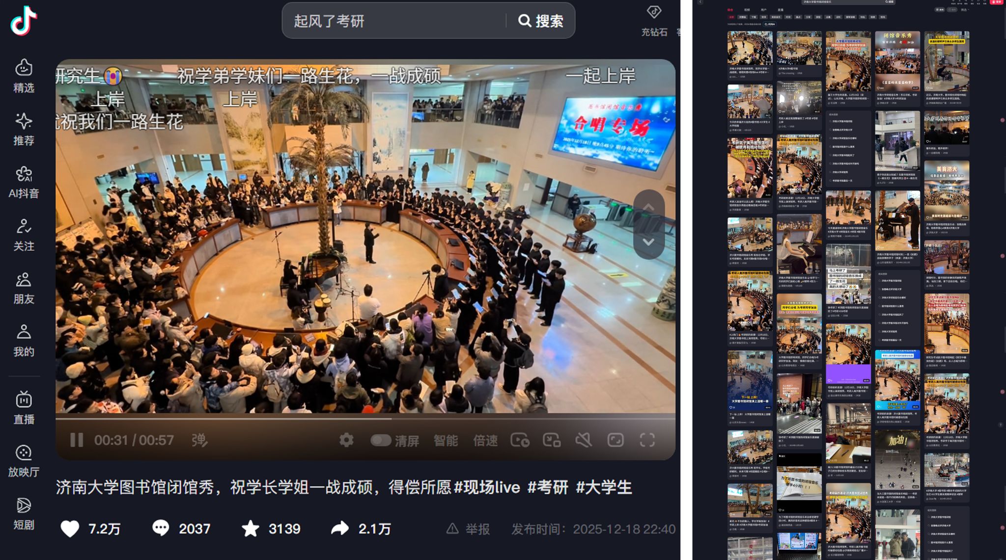 闭馆音乐秀引起了社会的积极反响,省内外不少媒体多次进行视频报道,对我馆及我校关心学生成长、拓展美育育人的手段给予了高度好评。12月18日现场一位学生发布的抖音视频,已经获得了7万多的点赞和2万多次的转发,网络影响力仍在不断扩大。